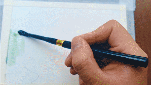 展開畫紙,最先捕捉到的是夏日魯朗層次豐富的綠意:嫩綠的草地鋪展開來,湖水映出清澈的藍綠色澤,遠處的山巒泛著淡淡青色,層層疊疊。道路在明媚的陽光下,潔白如雪,在綠色中蜿蜒,串聯(lián)起一個個藏式村落。