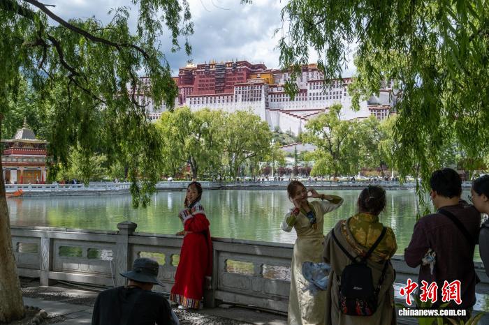 7月29日,游客在布達拉宮廣場東側(cè)人工湖附近“打卡”。中新社記者 江飛波 攝