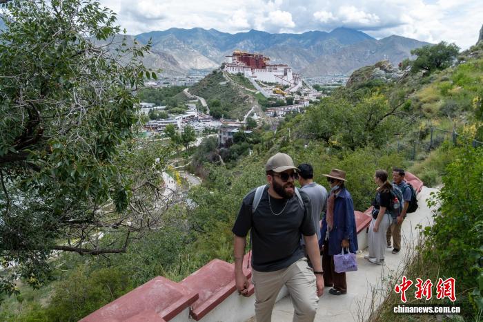 8月4日,外籍游客登上拉薩團結(jié)公園藥王山步道。中新社記者 江飛波 攝