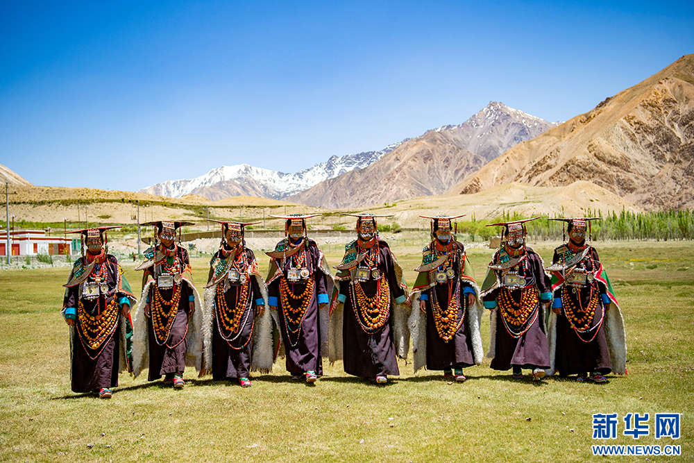 身著“普蘭服飾”的普蘭縣科迦村村民(6月10日攝)。“普蘭服飾”,主要由袍子、披風(fēng)、頭飾、項(xiàng)鏈、腰帶、耳墜、靴子組成。其中最精美、最獨(dú)特的為婦女服飾,外形設(shè)計(jì)如同孔雀開屏,被譽(yù)為“孔雀”服飾,一套重達(dá)20多公斤,裝飾有黃金、白銀、蜜蠟、珊瑚、綠松石等。新華網(wǎng) 旦增努布 攝