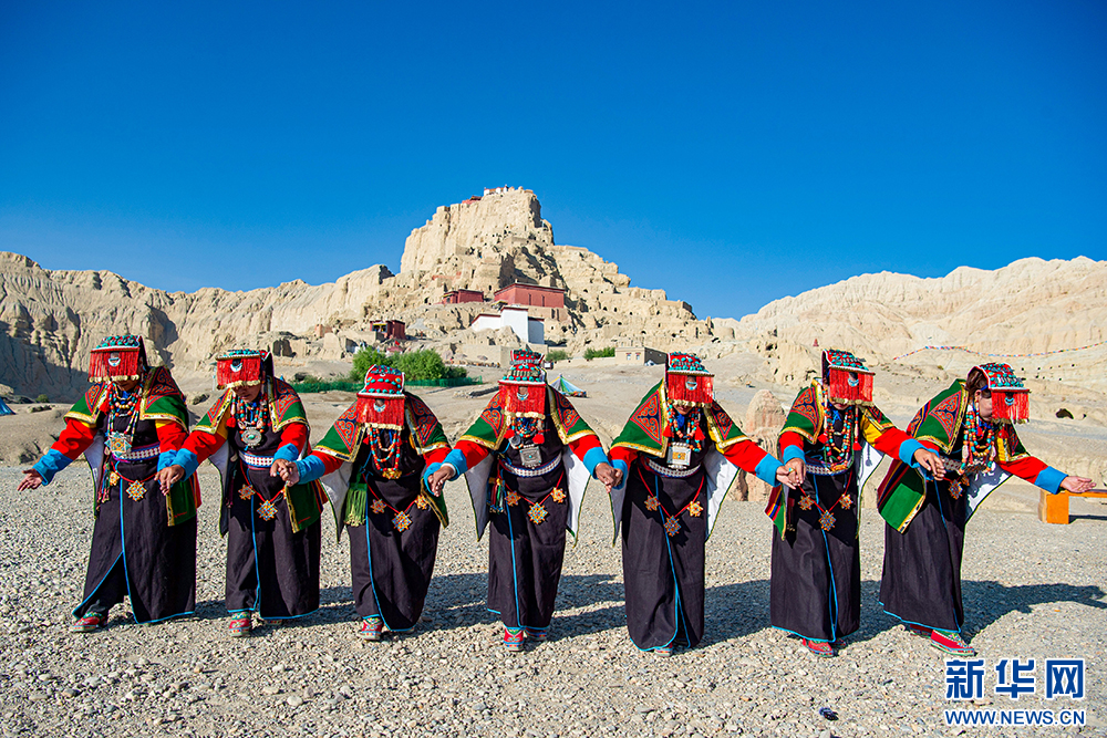 札達(dá)縣群眾在古格王國遺址腳下表演“宣舞”(6月12日攝)?!靶琛笔俏鞑匕⒗锩耖g傳統(tǒng)舞蹈,融合藏戲、舞蹈、說唱等傳統(tǒng)民間藝術(shù),內(nèi)容涵蓋禮儀、風(fēng)俗、節(jié)慶等。2008年,被列入國家級(jí)非物質(zhì)文化遺產(chǎn)名錄。新華網(wǎng) 旦增努布 攝