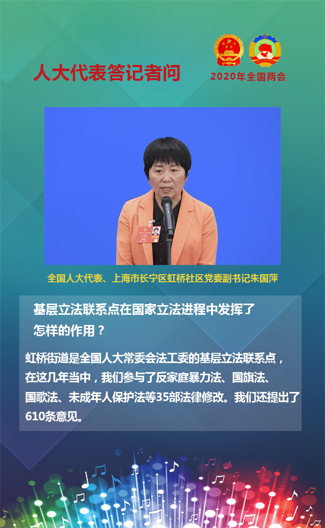 虹橋街道是全國(guó)人大常委會(huì)法工委的基層立法聯(lián)系點(diǎn),在這幾年當(dāng)中,我們參與了反家庭暴力法、國(guó)旗法、國(guó)歌法、未成年人保護(hù)法等35部法律修改。我們還提出了610條意見。