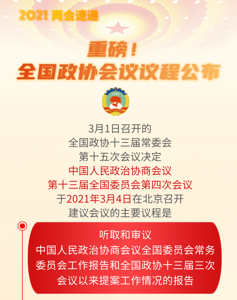 據(jù)新華社消息,3月1日召開的全國政協(xié)十三屆常委會第十五次會議決定:中國人民政治協(xié)商會議第十三屆全國委員會第四次會議于2021年3月4日在北京召開。[詳細] -
