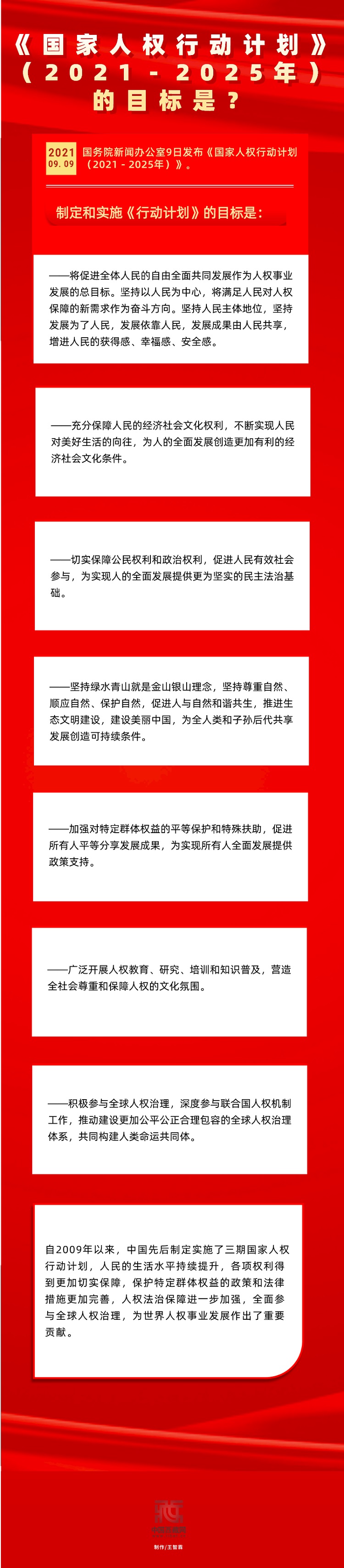 9月9日,國(guó)務(wù)院新聞辦公室發(fā)布《國(guó)家人權(quán)行動(dòng)計(jì)劃(2021-2025年)》,確定2021-2025年尊重、保護(hù)和促進(jìn)人權(quán)的階段性目標(biāo)和任務(wù)[詳細(xì)] -