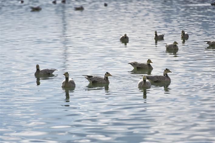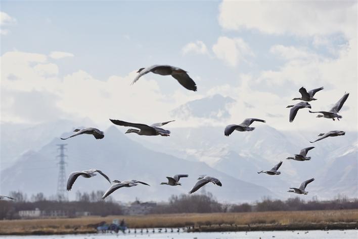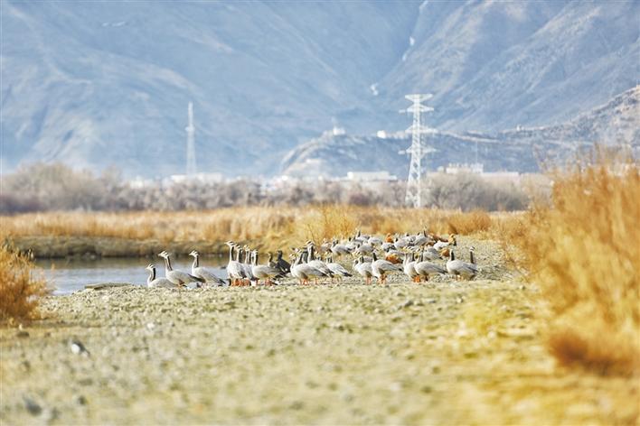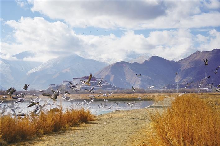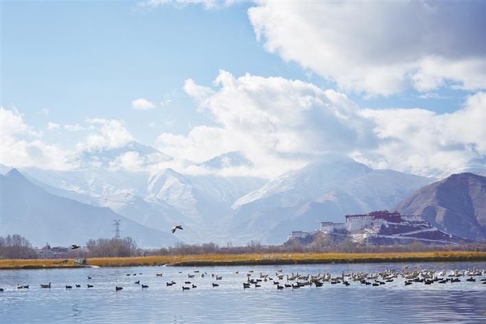 遠(yuǎn)處,連綿起伏的山頂還覆蓋著薄薄的積雪,布達(dá)拉宮雄偉而秀美;近處,濕地內(nèi)隨意顯現(xiàn)出的一塊塊水泊,成群的候鳥在水中玩耍嬉戲、在藍(lán)天白云下飛舞。見到可愛的飼養(yǎng)員帶來它們喜歡的麥粒,斑頭雁、紅隼、赤麻鴨、黃鴨等紛紛游上岸來,盡情地享受美食,發(fā)出歡快的叫聲。