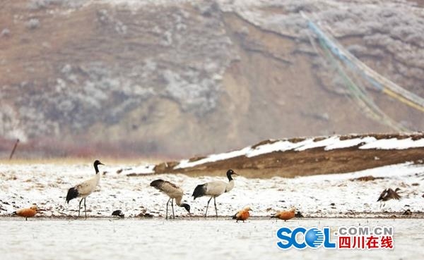 首批10余只黑頸鶴飛回高原 與牦牛和赤麻鴨和諧安家草原濕地
