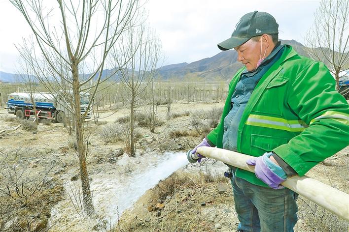 圖為工作人員在給樹(shù)苗澆水。洛克 記者 洛桑 唐斌 次旺 潘多 攝