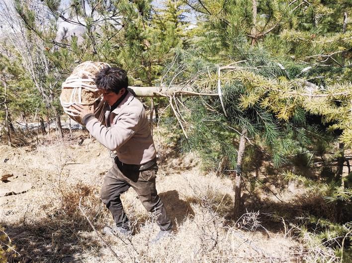 搬運準(zhǔn)備種植的苗木。文/圖 記者 李海霞
