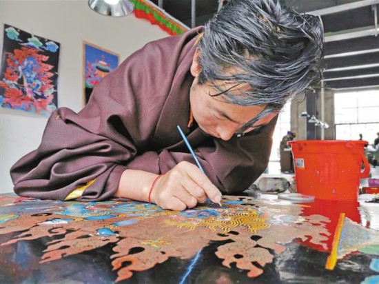 圖為唐卡漆畫技藝培訓(xùn)班學(xué)員正在繪制唐卡。 鄭曉強、周婷婷 攝