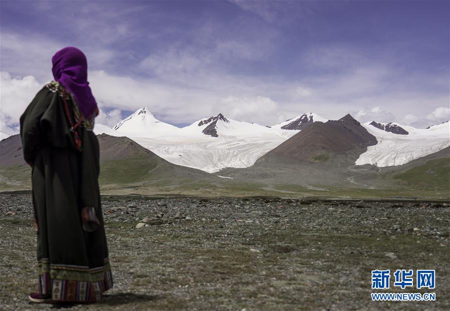8月15日,牧民在雪山腳下遠眺崗加曲巴冰川。 位于青海省玉樹藏族自治州的崗加曲巴冰川,坐落于長江源園區(qū)的各拉丹冬雪山東坡,從空中俯瞰,層疊的冰塔顯得尤為壯觀。 新華社記者 吳剛 攝