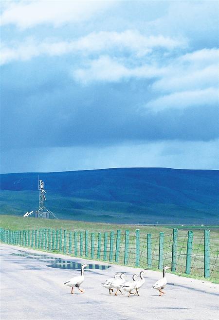 尕海湖畔,大豆雁領(lǐng)著小豆雁悠閑地穿過(guò)馬路。