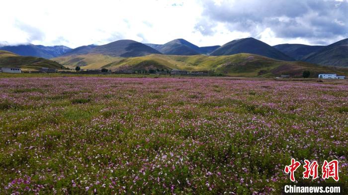 稻城縣噶通鎮(zhèn)八美村位于亞丁機(jī)場(chǎng)前往亞丁景區(qū)的交通要道上。長(zhǎng)期以來(lái),這片草原沙化現(xiàn)象日益嚴(yán)重,當(dāng)?shù)卮迕褓囈陨娴膫鹘y(tǒng)放牧都難以為繼。2016年以來(lái),稻城縣利用生態(tài)治理工程實(shí)施的契機(jī),整合全域旅游和脫貧攻堅(jiān)等涉農(nóng)涉旅資金,在沙化草原上大面積種植格?;?,將1599畝沙化草地打造成色拉花海。