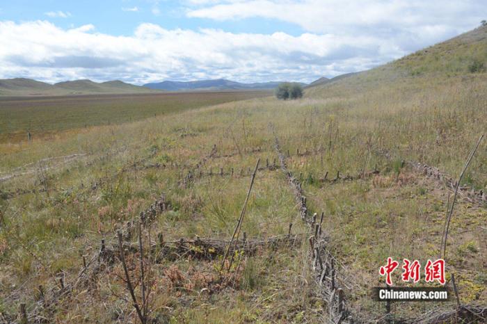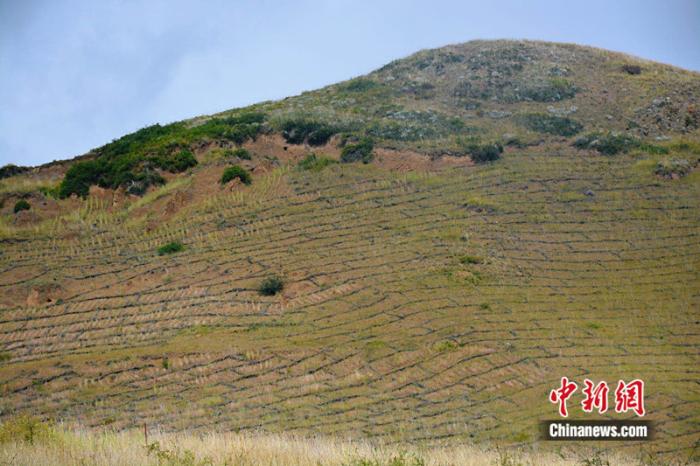 走進(jìn)四川省阿壩州若爾蓋縣轄曼鎮(zhèn)西倉(cāng)村治沙點(diǎn),山坡上巨大的“棋盤”格外醒目??h林草局生態(tài)修復(fù)股助理工程師涂勝介紹,這是用于治理草原沙化的高山柳沙障。