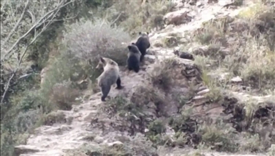 黑豹野生動物保護站站長李理介紹:“我們傍晚5點左右架設(shè)好設(shè)備, 6點30分左右就拍到藏棕熊了,當(dāng)時非常興奮”。他說:“當(dāng)時天馬上就黑了,山里忽然下起了冰渣子,藏棕熊就在樹林間若隱若現(xiàn),后來它跑到一個光禿禿的山下,它狀態(tài)很好,非常健壯?!焙芸?,大家又發(fā)現(xiàn)了第二只。隊員們的衣服都被冰渣子打濕了,高山上非常冷,但還是給相機做好防水,拍下了這寶貴的畫面。第二天傍晚,還是在同一地點,前一天晚上觀測到的一只藏棕熊再次出現(xiàn),不過這次,它帶了兩只小熊。大公熊強壯而霸道,帶幼崽的母熊小心謹慎,小熊憨態(tài)可掬,都非??蓯邸?/p>