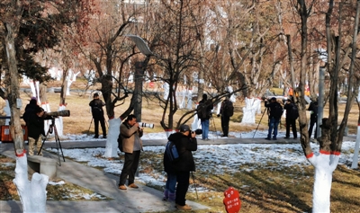 11月25日,記者來到海棠公園,從園方劉主任處了解到,太平鳥大約是一周前陸續(xù)來到海棠公園的,由最初的幾十只到現(xiàn)在的幾百只,甚至上千只,越聚越多。以前每年海棠公園也會有太平鳥光顧,但是沒有今年這么多。太平鳥每年來到海棠公園主要是來吃海棠果的,海棠公園500棵海棠樹,入冬后果實變得透紅,一串一串的紅果果,吸引了無數(shù)太平鳥到這里聚餐,成為海棠公園一道獨特的風(fēng)景。因每年這個時候都是太平鳥來海棠公園做客的時間,11月24日下午,海棠公園里早早的就聚集了二三十個等候的攝影師,其中有來自四川、甘肅、山西的,也有當?shù)氐臄z影愛好者。他們扛著“長槍短炮”不畏嚴寒蹲守著,全力以赴抓拍著太平鳥的美麗身姿。