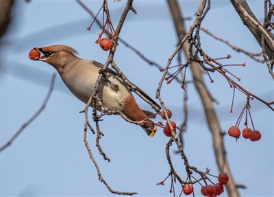 記者從省動物學(xué)會鳥類學(xué)分會成員胡老師處了解到,11月24日下午他也在海棠公園觀賞太平鳥,從比例估算這次大約有一千多只太平鳥飛來海棠公園,是近年來出現(xiàn)鳥兒最多的一年。去年海棠公園出現(xiàn)了約三百多只太平鳥,2017年、2018年它們出現(xiàn)的比較分散,在南山公園、寧湖濕地公園、海棠公園都有出現(xiàn),每處數(shù)量也只有五六十只,2018年在大通濱河公園也出現(xiàn)過,數(shù)量有二三十只左右。太平鳥在青海早就有記錄,太平鳥為鳥綱太平鳥科、體長約18厘米、壽命約13年左右。它們喜歡吃漿果,所以海棠果也就成為了它們的美味佳肴,春天也吃垂柳嫩葉,一般棲息于針葉、闊葉混交林中。