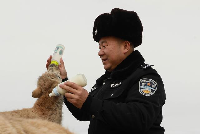 12月7日,在給藏羚羊幼仔喂奶前,可可西里索南達杰保護站站長趙新錄(中)用嘴測試奶溫。