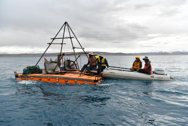 第二次青藏科考納木錯湖泊科考團隊利用搭建好的水上平臺,計劃鉆取100米深的湖芯,分析研究納木錯地區(qū)10到20萬年以來古氣候的演變過程及其機理。圖為2019年7月6日,科研人員駕船推動浮動平臺到指定區(qū)域投放錨鏈。新華社記者 李鑫 攝