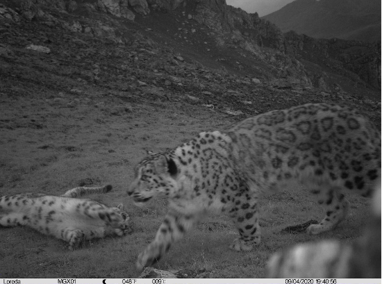 2020年10月5日,在祁連山東麓的青海省互助北山國家級(jí)森林公園首次拍攝到的雪豹“母子同樂”影像畫面。(資料照)