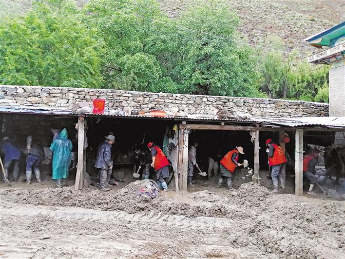 圖為林芝市朗縣滾村“兩委”、駐村工作隊(duì)組織村民開展清理淤泥活動(dòng)。 史金茹 攝