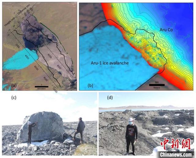 a。第一次冰崩在阿汝錯產生的巨大湖嘯;b。大量碎屑物質帶入阿汝錯,導致冰崩扇附近湖底地形產生顯著變化;c。冰體融化后冰崩扇上留下的巨石;d。大量碎屑物質。中科院青藏高原所 供圖