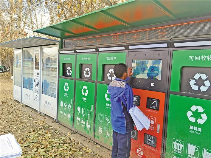 記者在林周縣城部分小區(qū)和學校內看到,安裝的智能垃圾分類設備已全部投入使用,智能分類回收箱箱體上標注著“紙張”“塑料”“金屬”等各類名稱。學生們只要在設備端口掃描校園班級卡上的二維碼,把廢紙、塑料瓶等垃圾依次分類放入“智能回收箱”,垃圾分類箱便會根據(jù)投放的垃圾自動稱重計算積分,并在學生的校園班級卡賬戶上增加相應的“垃圾兌換積分”,使用積分就可以在平臺兌換作業(yè)本、紙筆等學習用品。