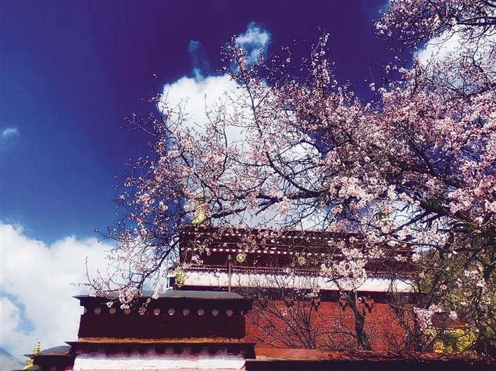 屬于帕崩崗的桃花,不像林芝桃花滿山遍野開,卻一如芬芳醉人的花草世界。粉色的桃花、藍色的天空、絢麗的藏裝、美麗的姑娘,在紅、黃廟墻的映襯下,在山坡上靜靜地開放,端然貞靜。