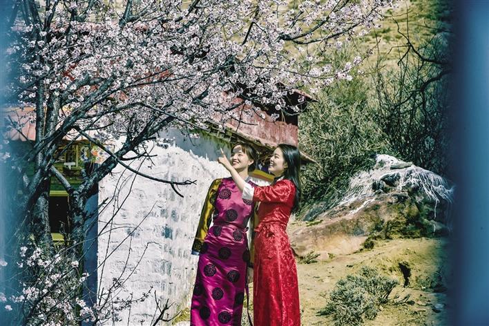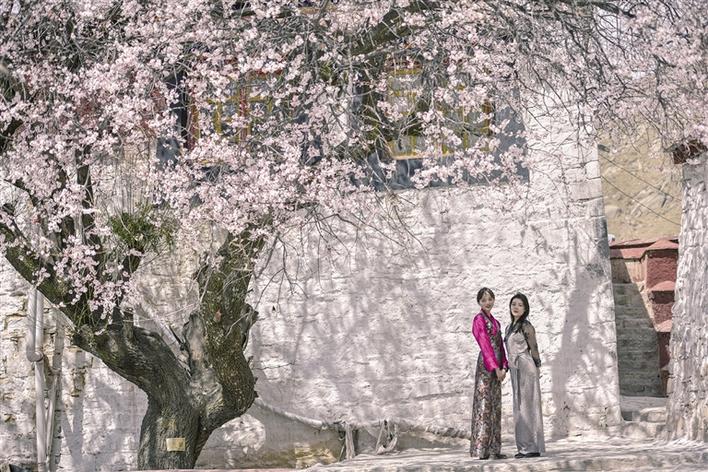 這里雖然沒有漫山遍野桃花次第盛開,但有花團錦簇、桃紅柳綠,幾棵桃樹,一陣春風吹過,花瓣如雨。身著藏裝的姑娘,與桃花合影,共赴春天的約會,看上去頗有些妖嬈的味道。