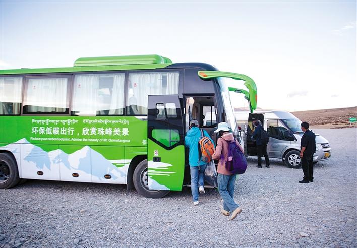 游客在珠穆朗瑪峰景區(qū)停車場轉(zhuǎn)乘環(huán)保客車(2019年5月16日攝)。珠穆朗瑪峰景區(qū)內(nèi)自2019年5月開始試運營清潔能源環(huán)保客車,以進(jìn)一步平衡珠峰地區(qū)旅游發(fā)展與環(huán)境保護(hù)需要。新華社記者 孫非 攝