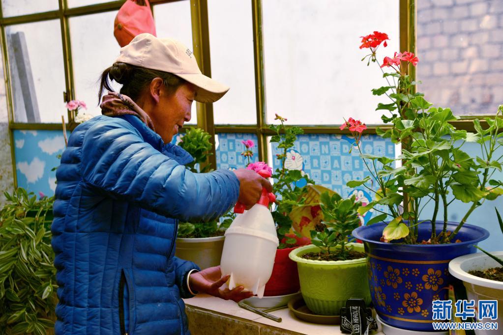 拉巴在新房內(nèi)澆花(2020年10月14日攝)。新華社記者 田金文 攝