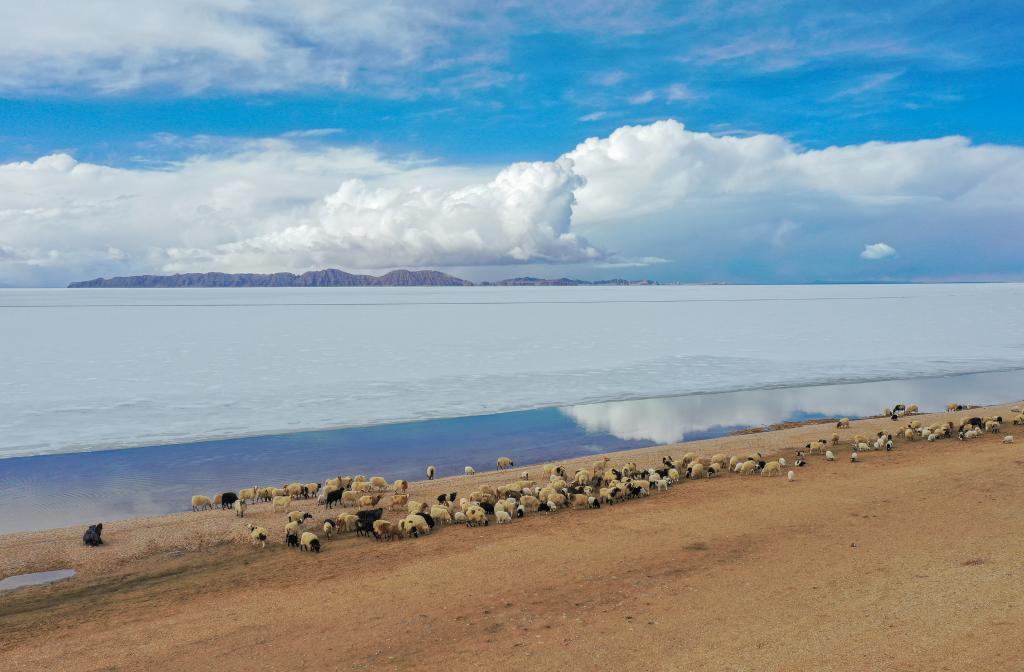 牧民指揮羊群從色林錯經過(2020年4月29日無人機攝)。新華社記者田金文 攝
