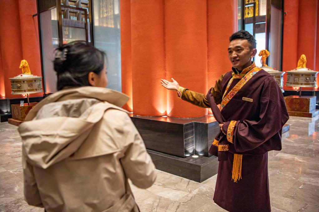 在魯朗恒大酒店,旦增正在引導(dǎo)客人(4月2日攝)。新華社記者 孫非 攝