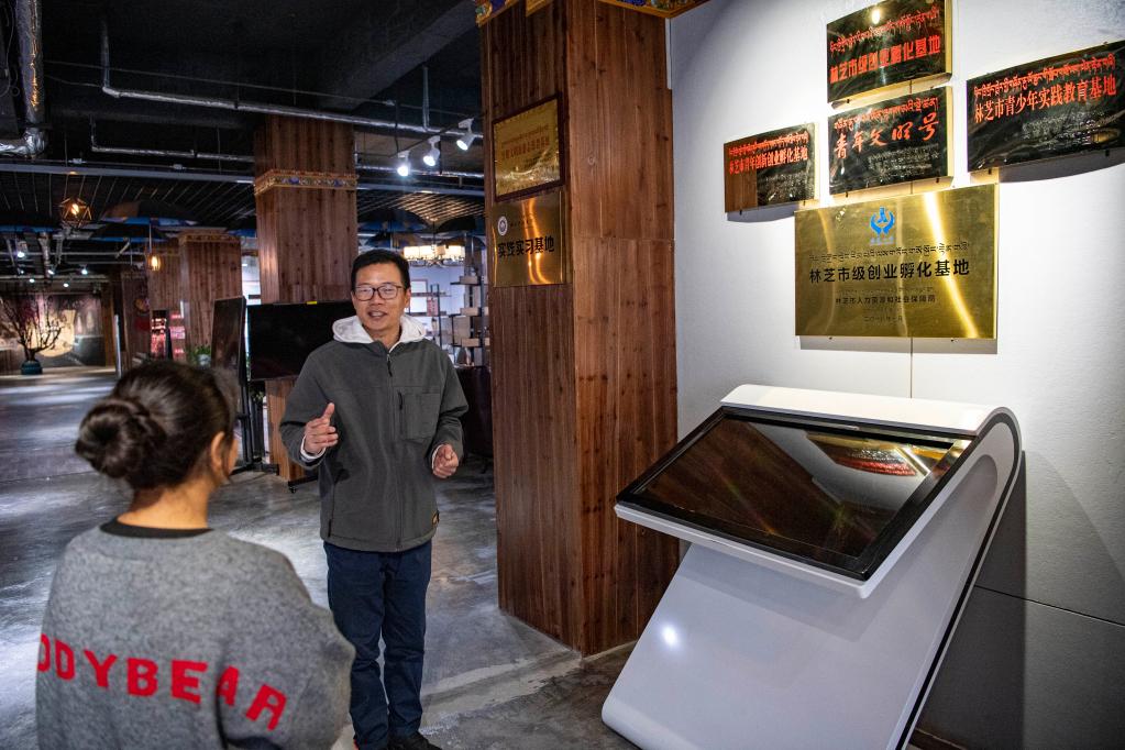 在林芝逐夢眾創(chuàng)產(chǎn)業(yè)園,陸錦華正在向?qū)嵙?xí)生介紹情況(4月2日攝)。新華社記者 孫非 攝
