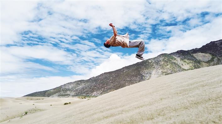 7月29日,記者從拉薩市驅(qū)車近100公里,來到位于山南市扎囊縣扎若村的沙漠公園,沙丘藝術(shù)公園幾個大字赫然映入眼簾。進入景區(qū),沙海起伏連綿,掀起金色波浪。因為前一日剛下過雨,地勢降低的地段里面積了一些水,在金黃的沙漠上,形成了大大小小的水坑,清澈見底,倒映著藍天白云,點綴了整片沙海。