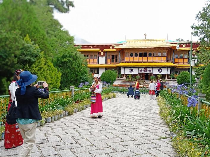 羅布林卡內(nèi)一步一景,每一處都能發(fā)現(xiàn)各類(lèi)品種的花卉,在達(dá)旦明久頗章前面的水池內(nèi),幾朵睡蓮在雨水的滋養(yǎng)下盡情舒展開(kāi)來(lái)。宮殿內(nèi)、石板路邊擺放的一盆盆盛開(kāi)的鮮花,像是臉上堆滿(mǎn)了笑容的少女。人們對(duì)于優(yōu)美的風(fēng)景總是毫無(wú)抵抗力,紛紛拿起手中的相機(jī)、手機(jī)拍照留念,讓美好瞬間定格于此。連一旁休憩的老奶奶都情不自禁地想幫路人拍照。