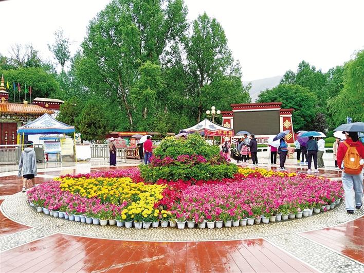 在羅布林卡廣場(chǎng),擺放的花卉吸引人們拍照打卡留念。走進(jìn)園內(nèi),一陣清涼感迎面撲來(lái),雨后的羅布林卡空氣濕潤(rùn),除了花草的香味還可以聞到一絲泥土的氣息。充沛的雨水讓園內(nèi)的樹(shù)木更加蔥郁、花朵更加?jì)善G。作為每年盛夏時(shí)期拉薩市區(qū)內(nèi)最佳的避暑去處,羅布林卡吸引著本地市民群眾、區(qū)外游客紛至沓來(lái)。