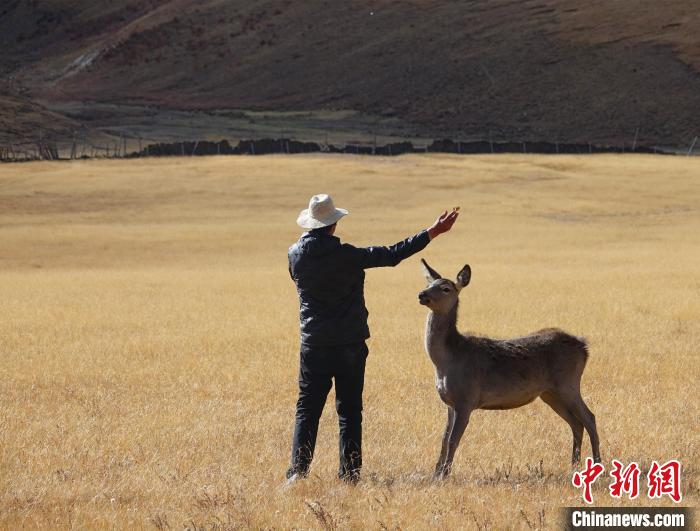 圖為西藏類(lèi)烏齊馬鹿國(guó)家級(jí)自然保護(hù)區(qū)的管護(hù)員正在飼喂馬鹿?!∪轿木?攝