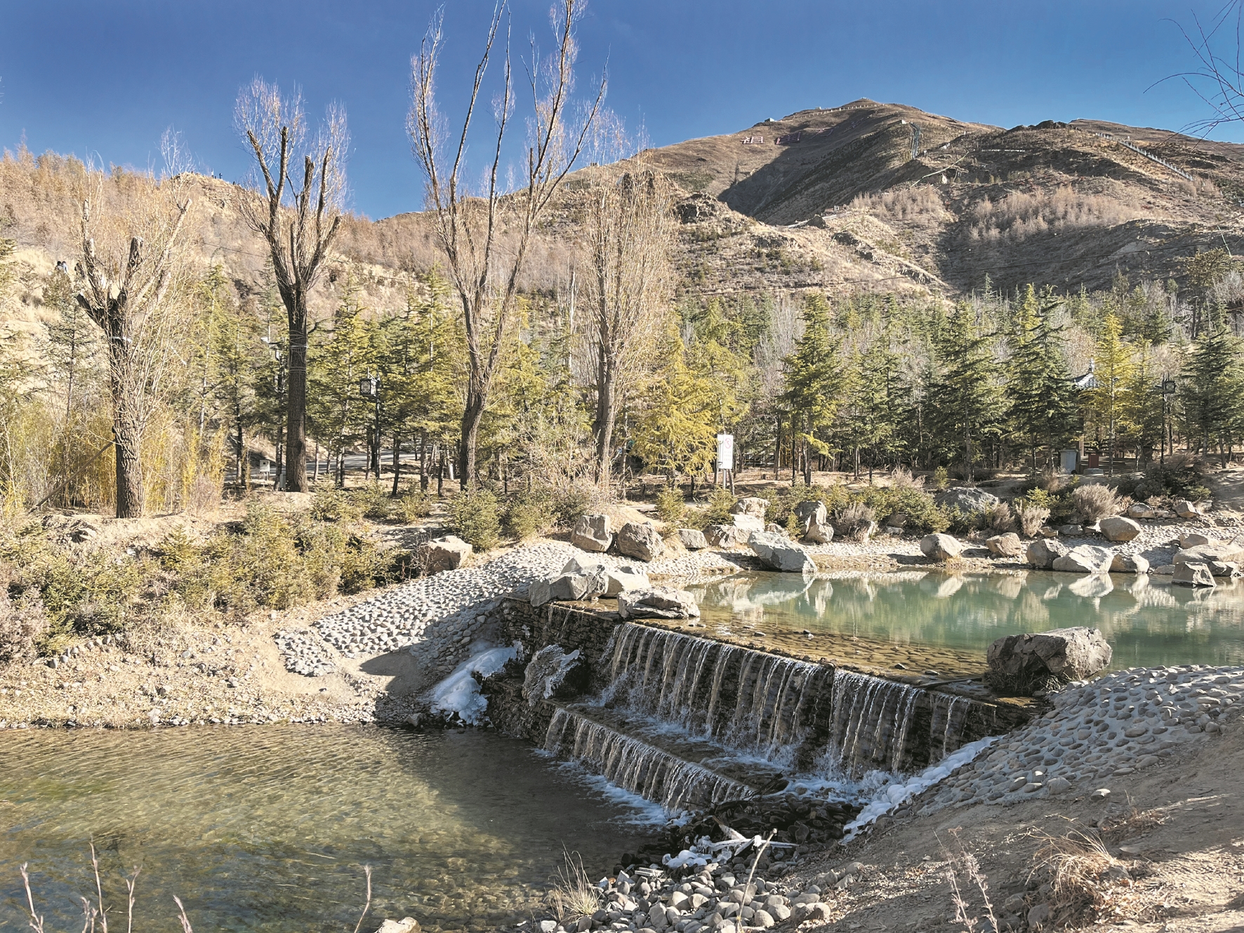 除了宗角祿康公園,位于布達(dá)拉宮正南方的南山公園也是冬游拉薩的不二選擇。山上灌木叢生,橋下流水叮咚,這便是冬日里的拉薩南山公園。得益于“樹上山”工程的成功實(shí)施,如今一年四季的南山公園都是成片的松柏和叮咚的泉水,這些都使園區(qū)具有別樣的冬日美。
