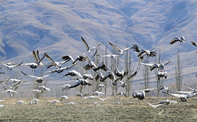 冬日的山南,又一次迎來(lái)了一群特殊的客人——黑頸鶴。成群的黑頸鶴在田野悠閑地覓食、嬉戲,給冬季增添了生機(jī)和活力,呈現(xiàn)出一幅人與自然和諧相處的絕美畫卷?! ?/p>