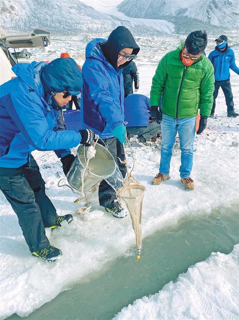 在姜根迪如冰川前的河道采取水生物樣本時(shí),于愛琛要鑿開近10厘米的冰面,冰渣子進(jìn)入收集網(wǎng)里,又要用手取出來。即使戴著手套,刺骨的水溫也能通過手指使寒意襲遍全身,他整個(gè)手臂如同電量快耗盡的機(jī)器,緩慢機(jī)械地進(jìn)行著工作。但由于氣溫太低,沾了水的收集網(wǎng)很快又會被凍住,為了抓緊時(shí)間將樣本裝入瓶中,于愛琛索性取下手套,用開水將結(jié)冰的收集網(wǎng)融化,這一冷一熱間,整雙手早已麻木。當(dāng)時(shí),于愛琛整個(gè)臉都是發(fā)腫鐵青的,紫黑色的嘴唇完全爆皮,說話時(shí)血從嘴唇皸裂處流出也不自知。