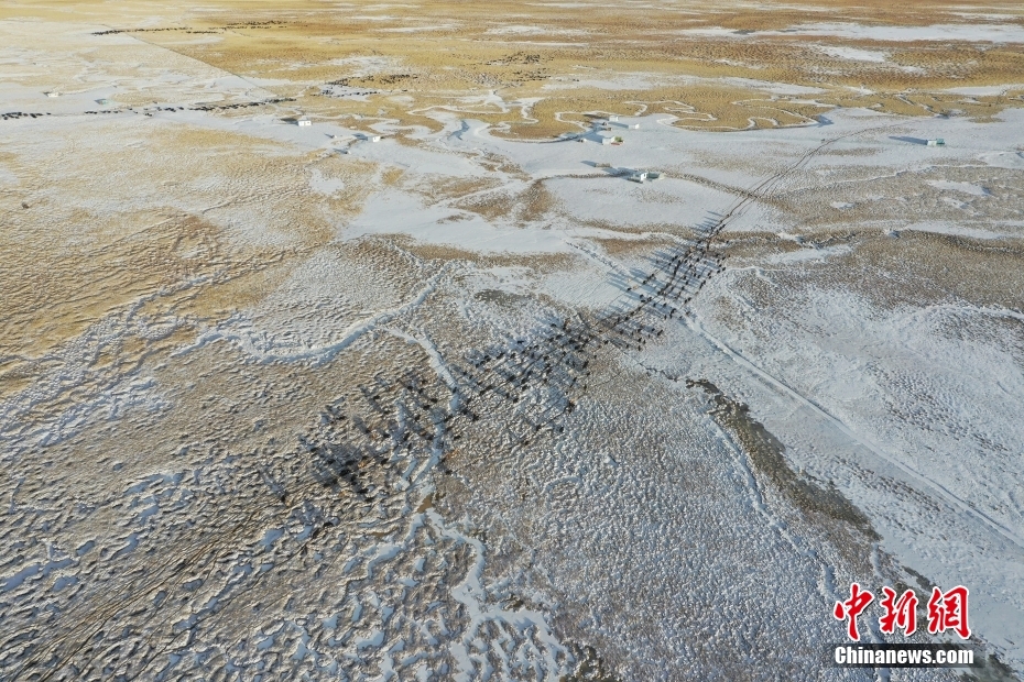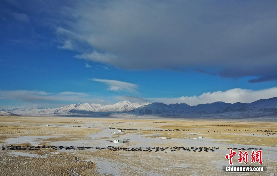 1月27日,當雄縣龍仁鄉(xiāng)烏達村牧民趕著牛羊去牧場。當雄縣位于西藏自治區(qū)拉薩市北部,距拉薩市區(qū)170公里?!爱斝邸?,藏語意為“天選牧場”,平均海拔約4200米,草場廣闊,土地肥沃。(無人機照片) 中新社記者 貢嘎來松 攝