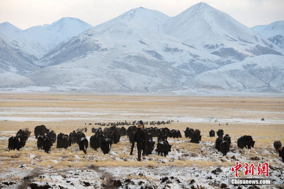1月27日,當雄縣龍仁鄉(xiāng)烏達村牧民在雪中放牧。當雄縣位于西藏自治區(qū)拉薩市北部,距拉薩市區(qū)170公里?!爱斝邸保卣Z意為“天選牧場”,平均海拔約4200米,草場廣闊,土地肥沃。 中新社記者 貢嘎來松 攝