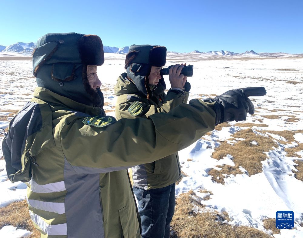2021年12月3日,祁連山國家公園沙龍灘管護(hù)站站長祁進(jìn)賢(右)在用望遠(yuǎn)鏡觀測。新華社 李琳海 攝