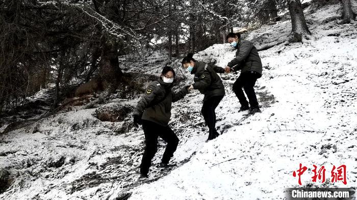 圖為巡護(hù)途中相互扶持?!±铍h 攝