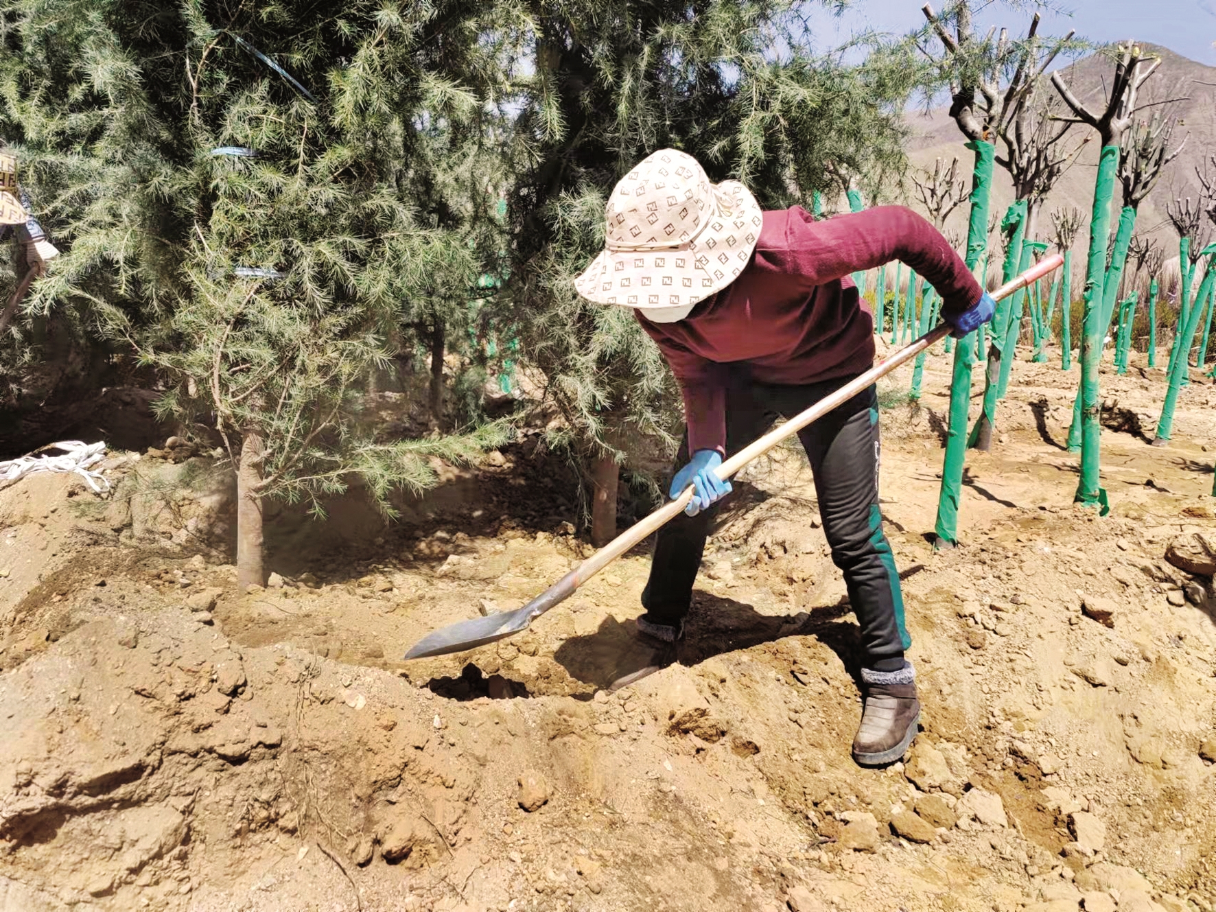 當(dāng)前拉薩天氣晴好,氣溫回升,正是育苗植樹的好時節(jié)。扶正樹苗、填土壓實……在拉薩市曲水縣茶巴朗村水土保持生態(tài)園里,縣水利局組織附近村民移植培育松樹、蘋果樹、桃樹等林木,大家三五成群忙得不亦樂乎。