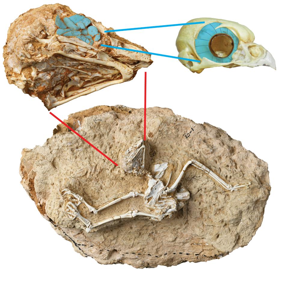 日行中新猛鸮化石及眼部骨骼聚焦,藍(lán)色覆蓋處為鞏膜骨。(中科院古脊椎所供圖)