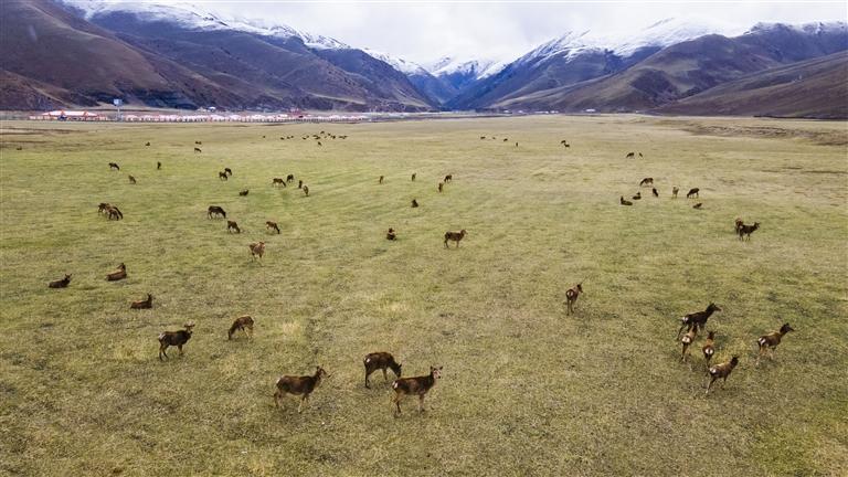 5月21日在類烏齊馬鹿國(guó)家級(jí)自然保護(hù)區(qū)拍攝的馬鹿(無(wú)人機(jī)照片)。新華社記者 周荻瀟 攝