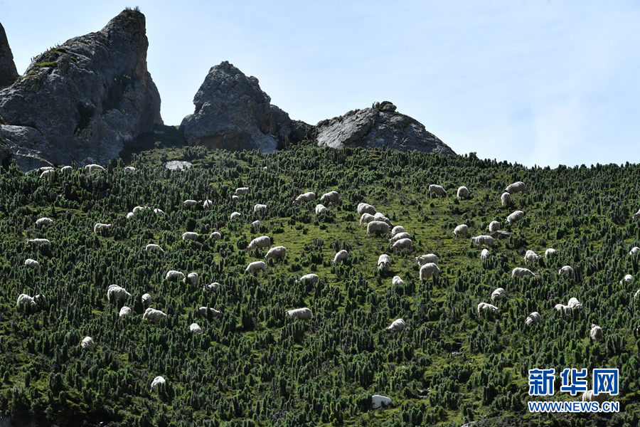 遍山的羊群在天峻溝內(nèi)吃草。新華網(wǎng) 卡婭梅朵 攝
