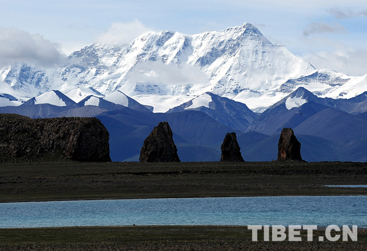 這是納木錯(cuò)北岸的小島石柱和念青唐古拉山主峰及湖水構(gòu)成了一道美麗的風(fēng)景線(唐召明2012年8月4日攝)