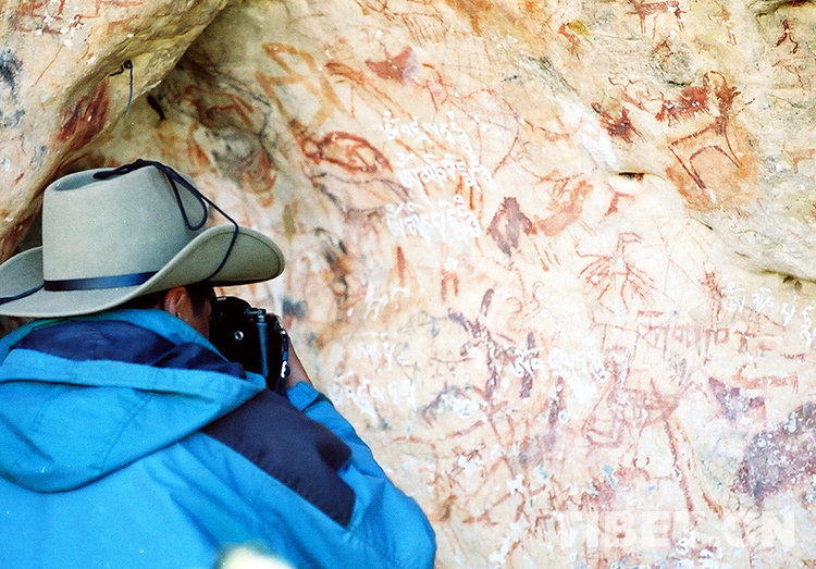 這是科考人員在對(duì)一處洞穴巖畫進(jìn)行考察(唐召明2001年攝)